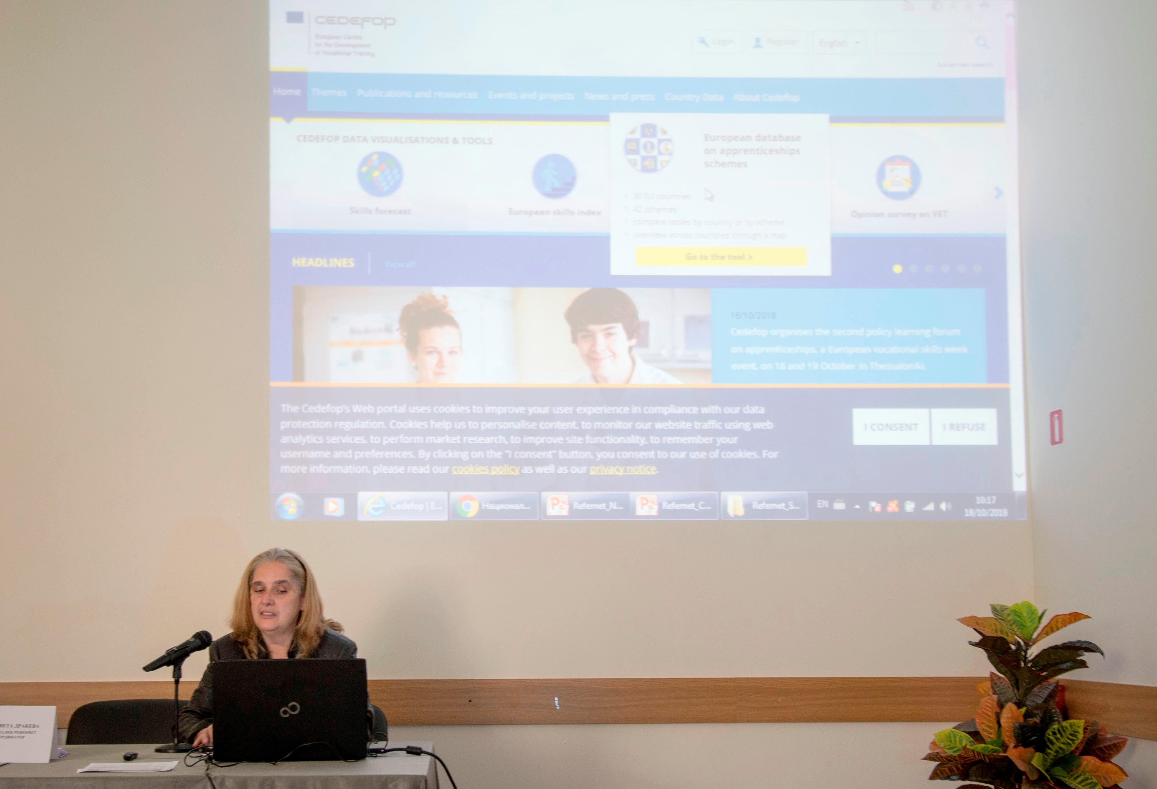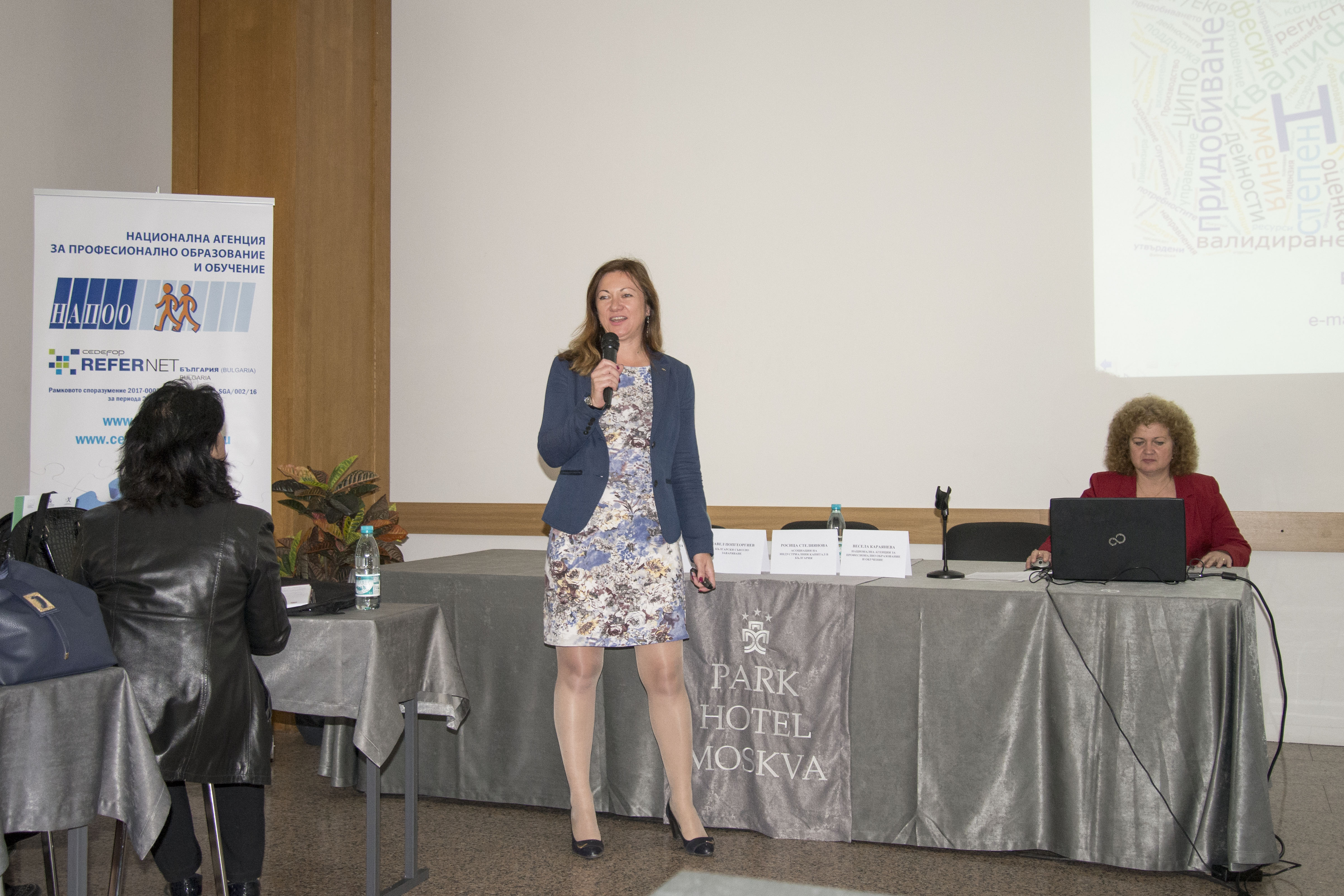Участниците се запознаха с ролята и дейността на Европейския център за развитие на професионалното обучение (CEDEFOP) и на Европейската мрежа за обмен на опит в професионалното образование и обучение (ReferNet). Презентирани бяха начините за достъп до актуални доклади, анализи, изследвания, публикувани на интернет-страниците на CEDEFOP и ReferNet. Представен беше актуален доклад за състоянието на ПОО в България заедно с кратко атрактивно видео за системата на ПОО в нашата страна.